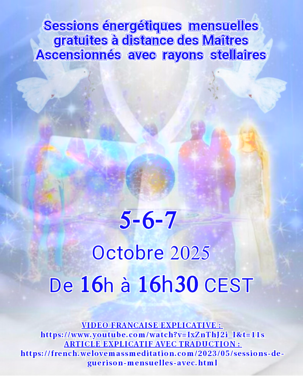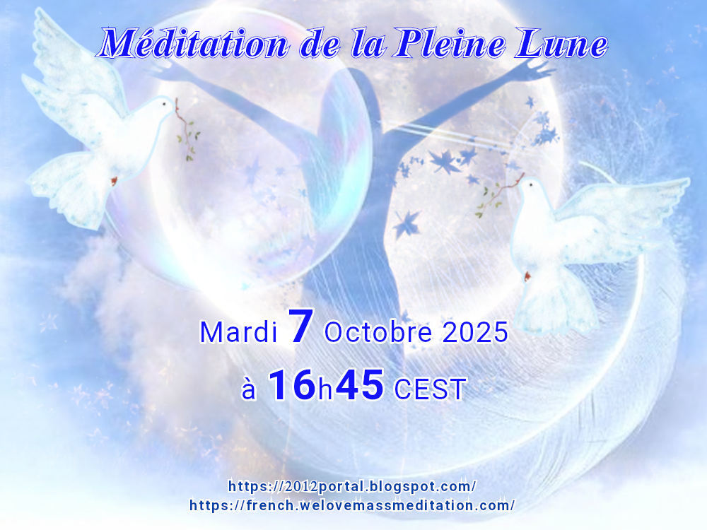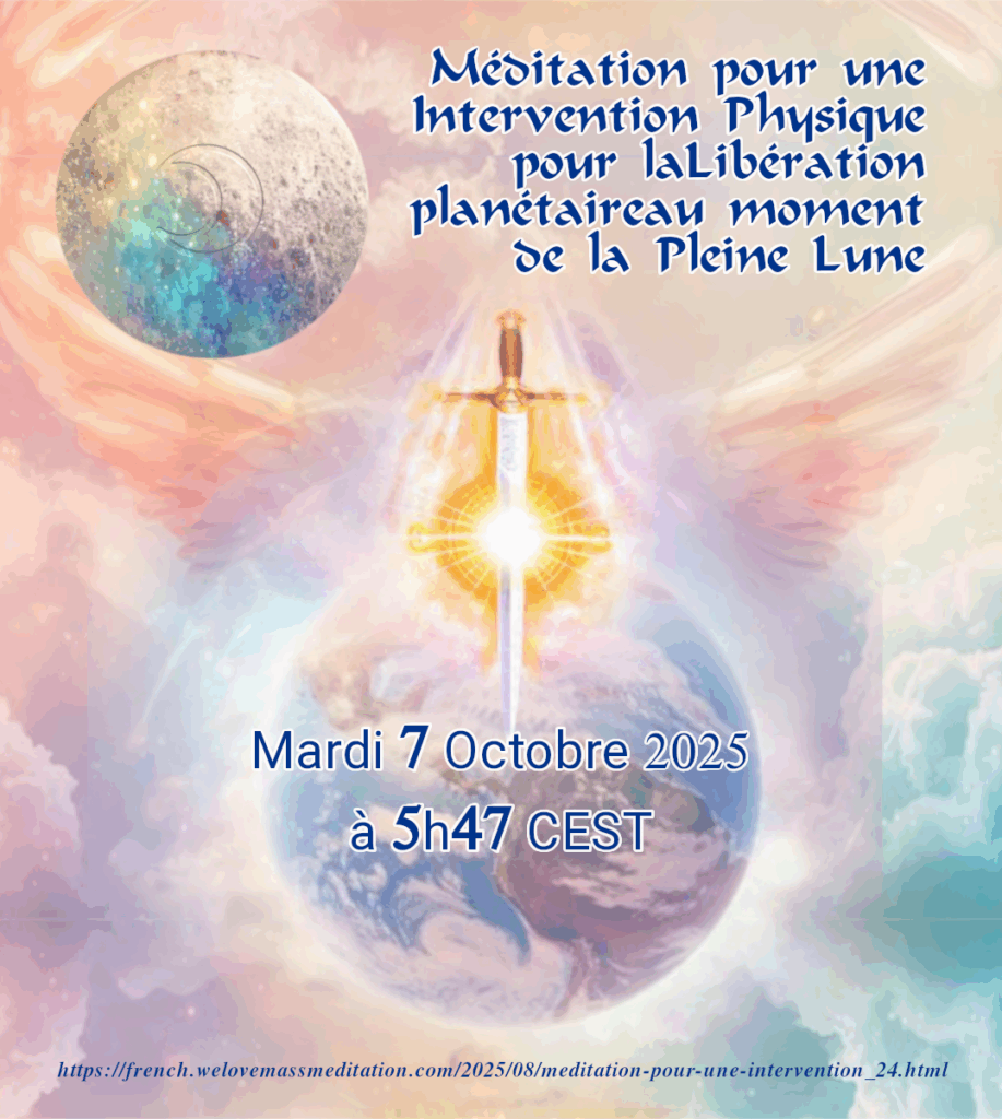 Voici un rappel des méditations de pleine lune ,des sessions énergétiques gratuites à distance entre le 5 et le 7 Octobre 2025 et la méditation pour une Intervention Physique pour Libération planétaire le 7 Octobre à 05h47 CEST heure française d’été.