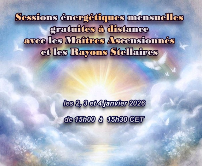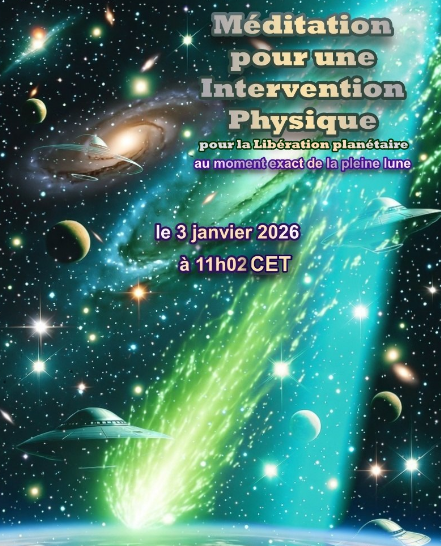 Voici un rappel des méditations de pleine lune ,des sessions énergétiques gratuites à distance entre le 2 et le 4 Janvier 2026 et la méditation pour une Intervention Physique pour Libération planétaire le 3 Janvier à 10:02 AM UTC (11h02 CET heure française d’hiver) et d’autres méditations importantes.