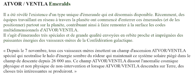 Un réseau de Grille énergétique d’émeraudes ATVOR/VENTLA est stratégiquement positionné au sein de la grille de Lumière planétaire. Les émeraudes ATVOR/VENTLA sont des pierres qui ont été placées dans la zone la plus proche de l’Espace et qui y ont été imprégnées des énergies des vaisseaux-mères de la Confédération Galactique. Les émeraudes ATVOR/VENTLA sont un pont cosmique entre le Nouveau Ciel et la Nouvelle Terre :